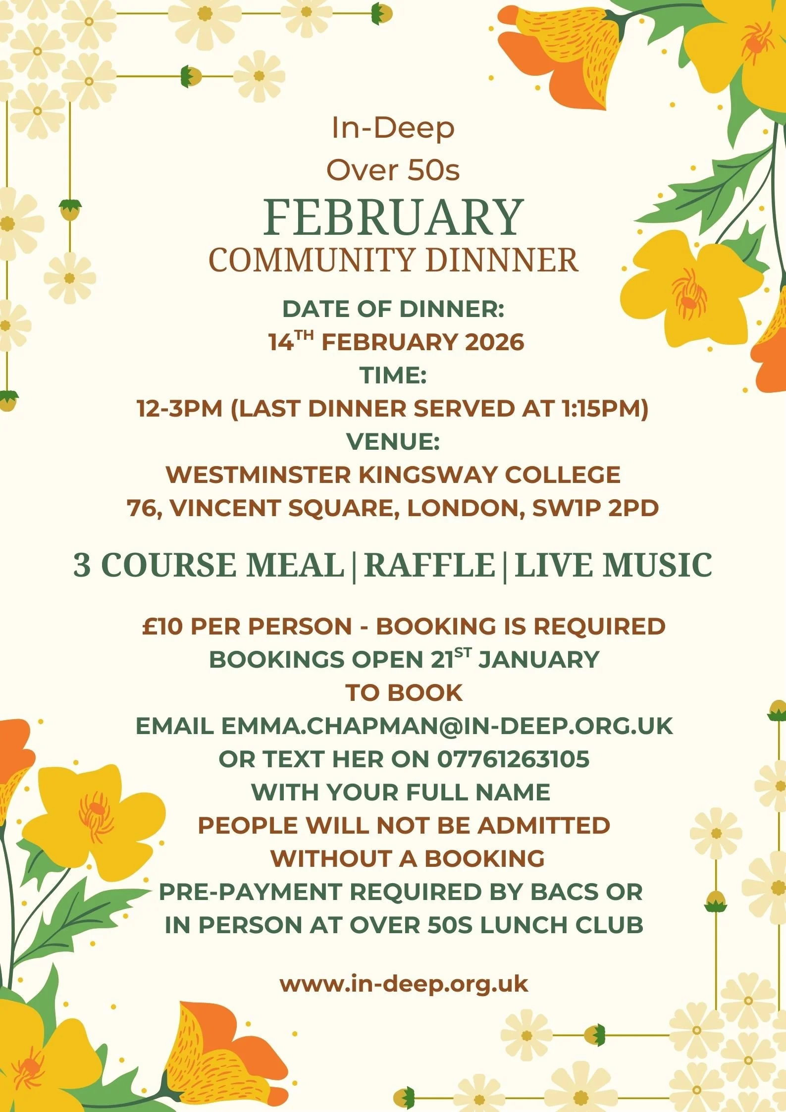 Please be aware pre-payment is required to attend the Community Dinner this can be done by Bacs or in person at the Over 50s Lunch on Wednesdays - please contact Emma for Bacs details emma.chapman@in-deep.org.uk